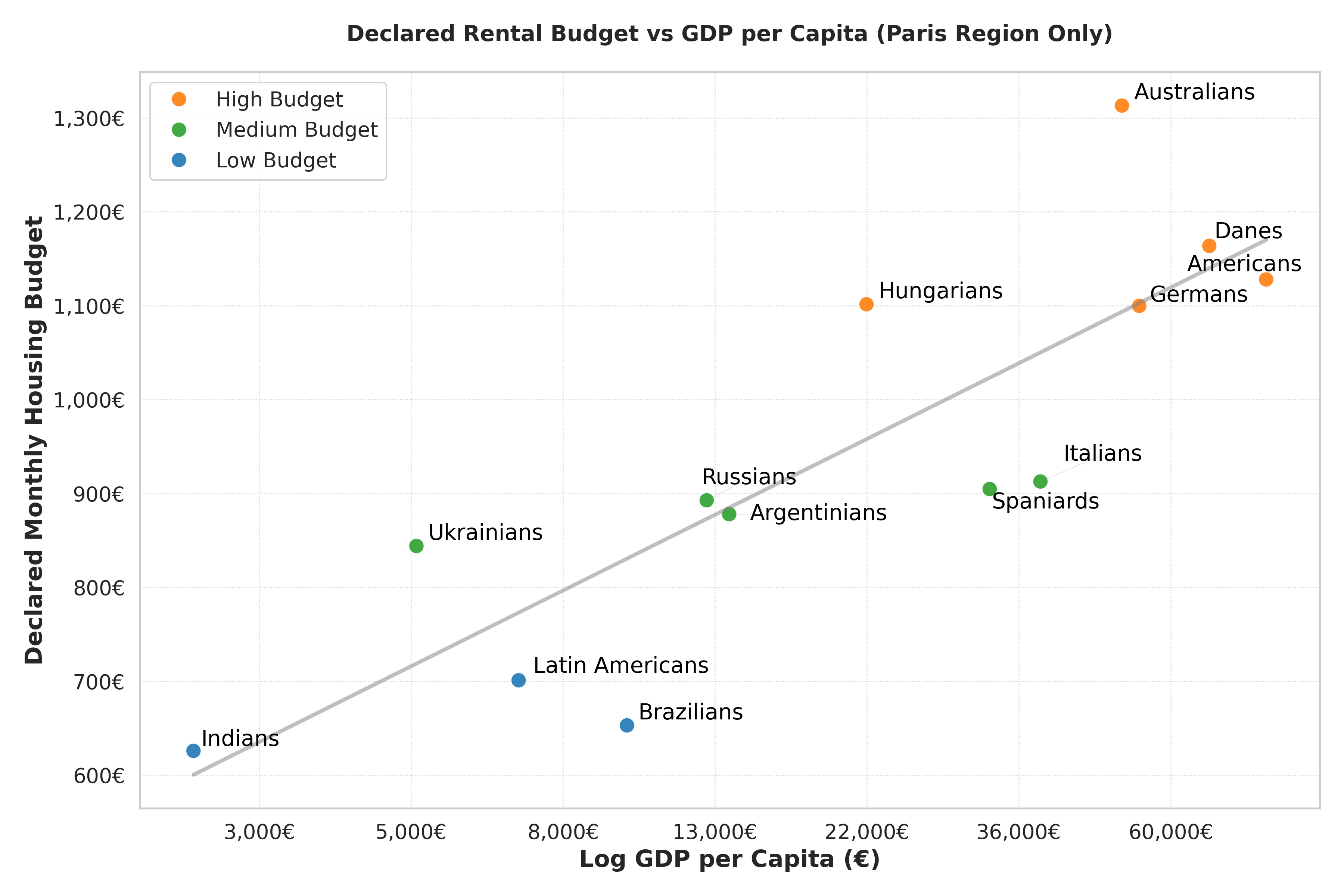 A clear pattern emerges: migrants from higher-GDP countries tend to report significantly higher expected rental budgets. While not surprising, this supports the idea that the variation between groups reflects meaningful socioeconomic differences.